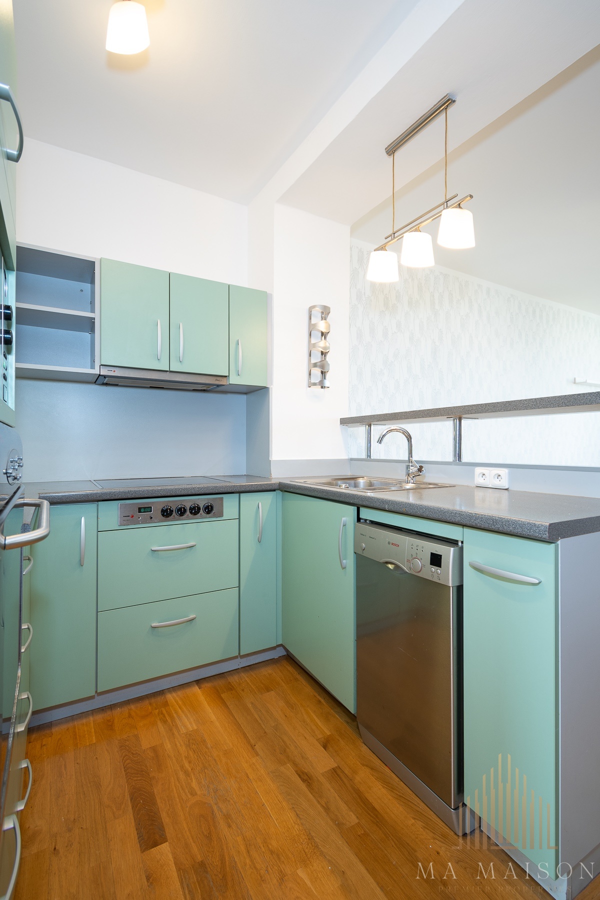 The apartment is divided into a spacious living room, which includes a kitchen unit. Also a bedroom, bathroom, bedroom and children's room. From the corridor there is an entrance to the living room and the bathroom. The entrance to the bedroom and children's room is from the living room. The kitchen is fully equipped (oven with hob - induction, fridge + freezer, hood, microwave and dishwasher). The living room is equipped with a dining table with dining chairs and a TV table. There is also access to the balcony from the living room. A hallway leads through the apartment, which is equipped with a wardrobe and a shoe rack. A big advantage is that the bathroom is equipped with both a bathtub and a shower. The bedroom is equipped with spacious built-in wardrobes, which offer a really large amount of storage space. The children's room is fully equipped. There is a work desk with a chair, a children's bunk bed with storage space.