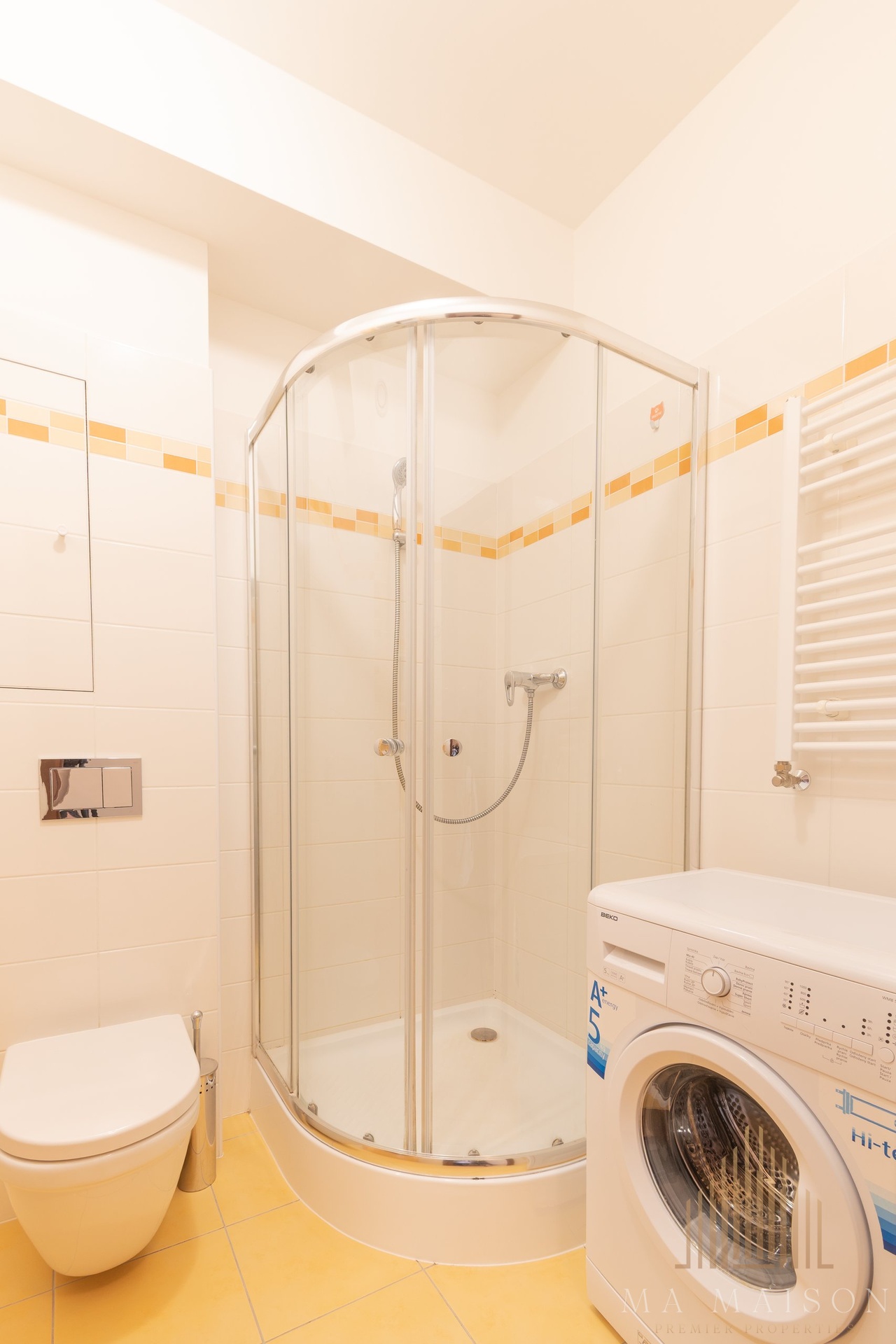 Byt se nachází v 8.patře bytového domu s výtahem a sestává: ze vstupní předsíně, koupelny se sprchou, toaletou a umyvadlem. K dispozici je také pračka. Další místností je obývací pokoj s kuchyňským koutem. Kuchyňská linka je vybavena sporákem s digestoří a lednicí.