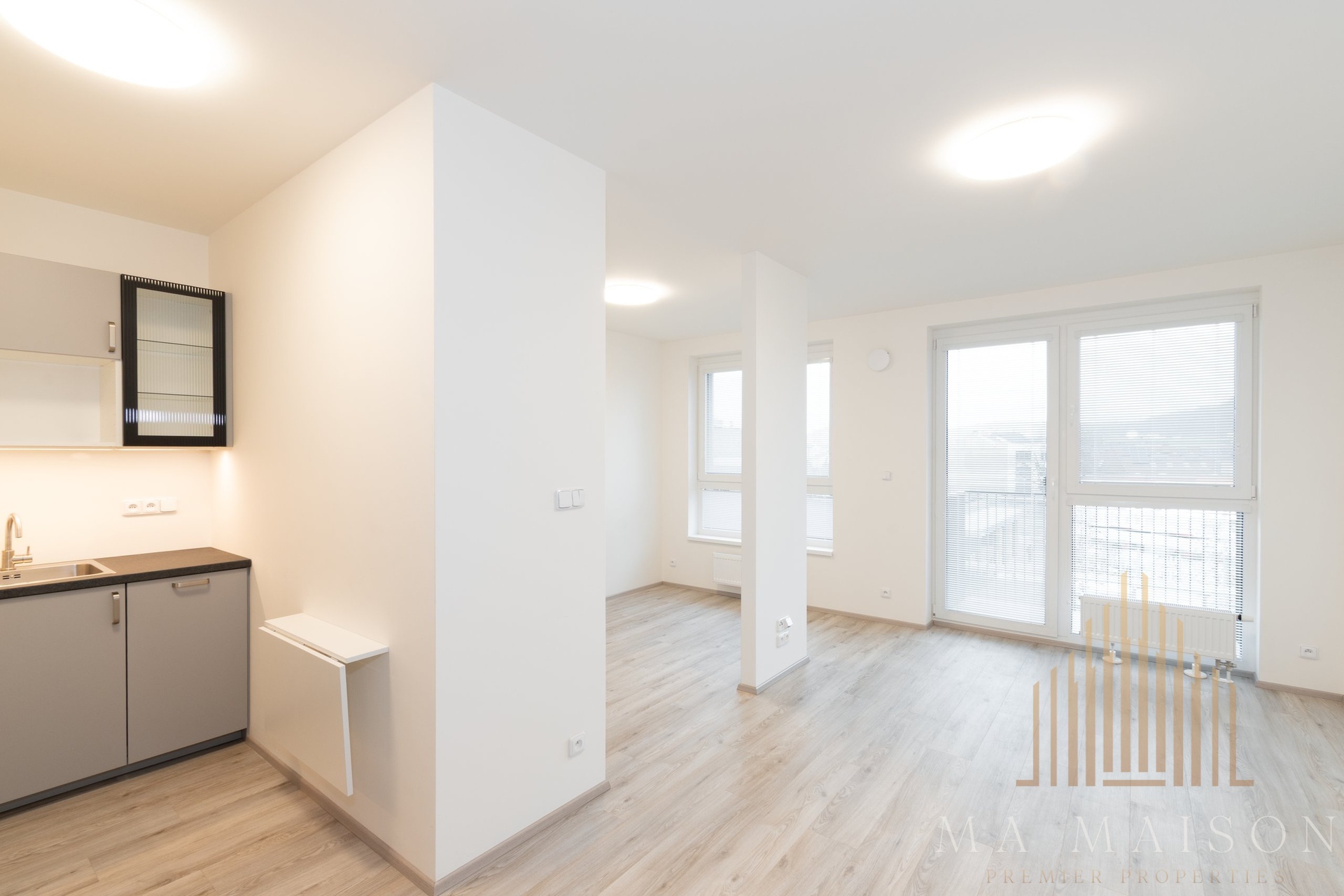 Byt je dispozičně velmi prakticky řešen. V předsíni se nachází šatní skříň. Koupelna je vybavena vanou, umyvadlem se zrcadlem a WC. Hlavní obytný prostor s kuchyňským koutem nabízí moderní kuchyňskou linku se všemi spotřebiči – sporákem, troubou, digestoří, myčkou a lednicí s mrazákem.