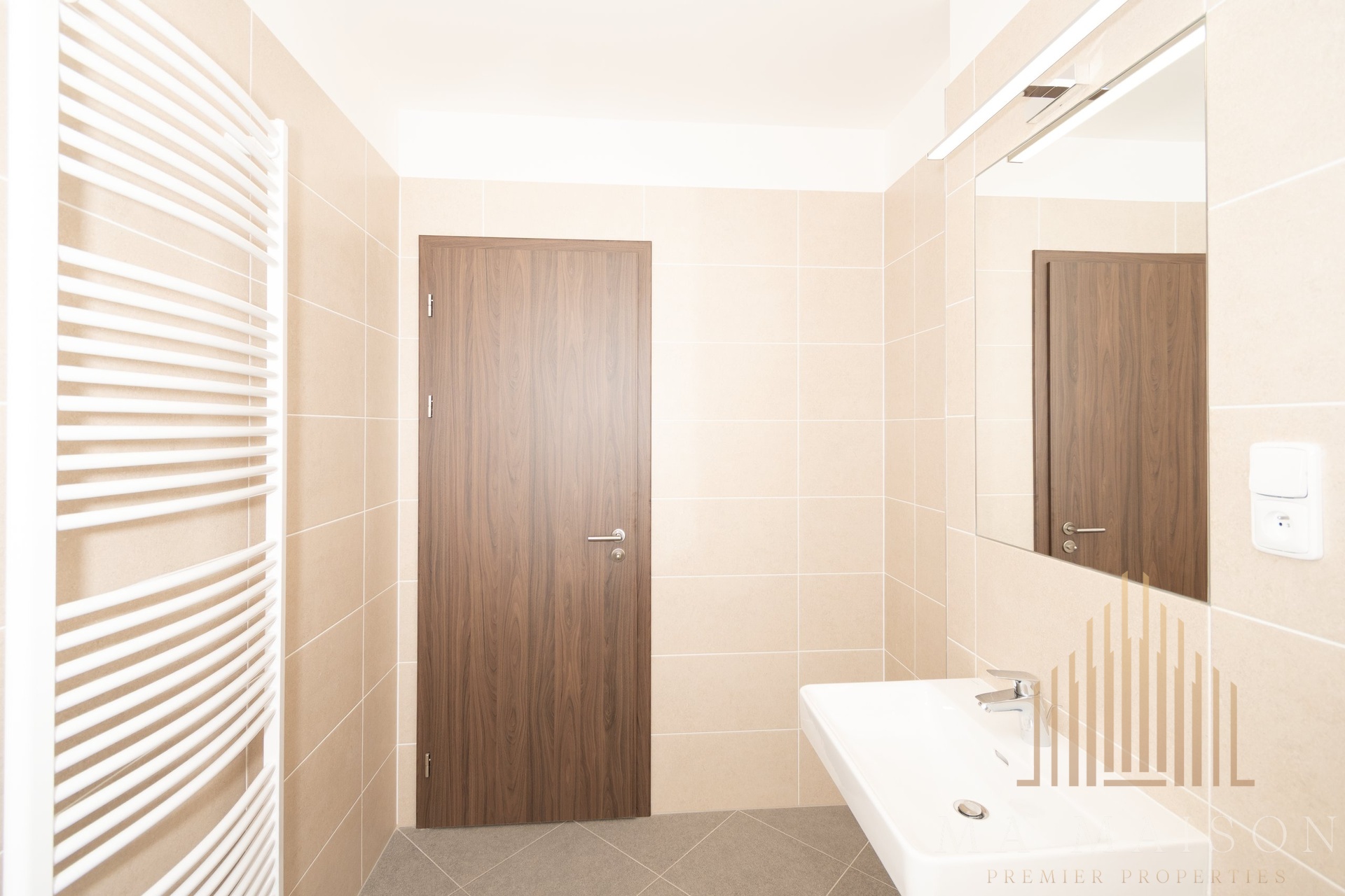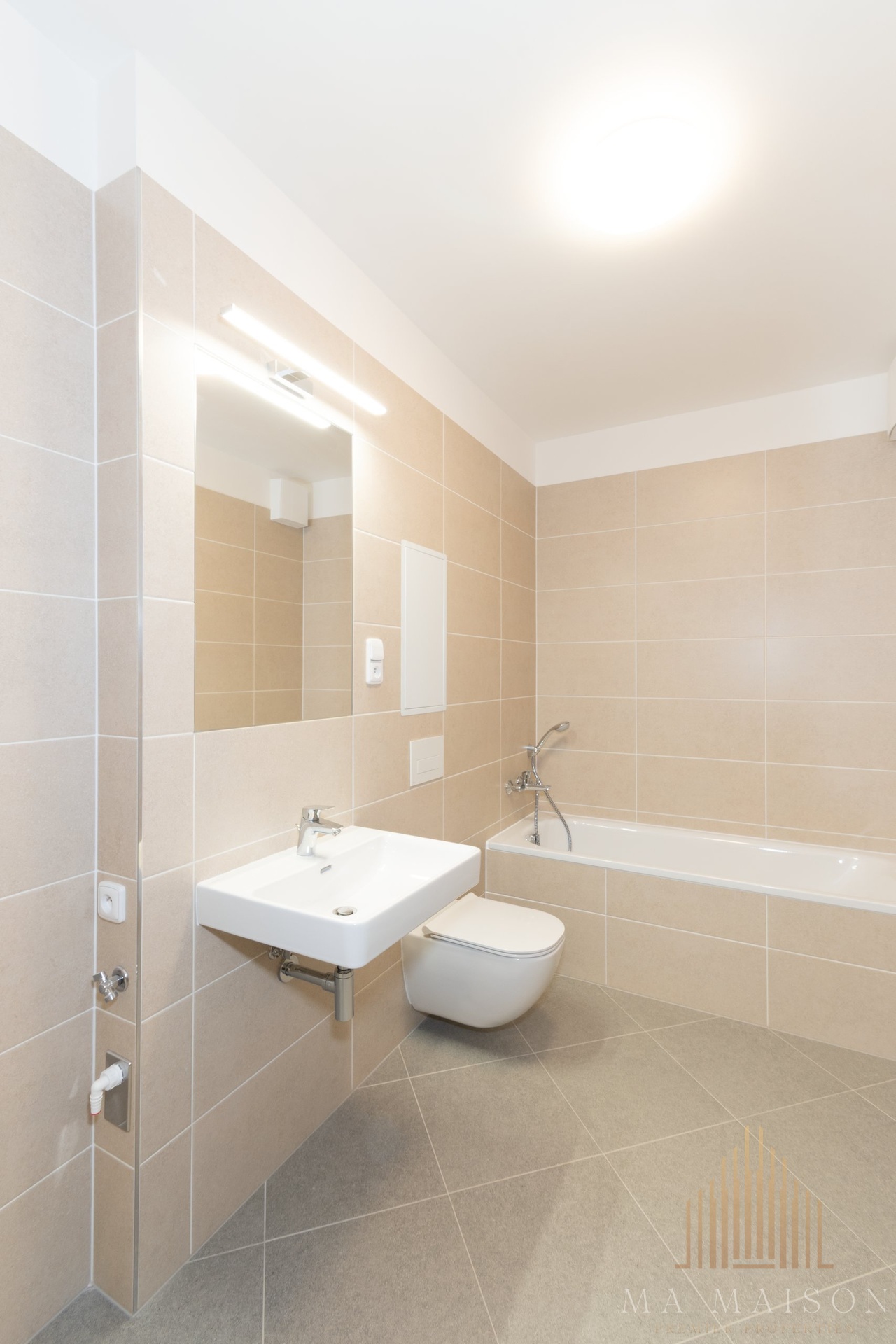Dispozičně je byt řešen velmi prakticky. Ve vstupní chodbě se nachází šatní skříň. Koupelna je vybavena vanou, umyvadlem se zrcadlem a WC. Hlavní obytný prostor s kuchyňským koutem nabízí moderní kuchyňskou linku se všemi spotřebiči – sporákem, troubou, digestoří, myčkou a lednicí s mrazákem.