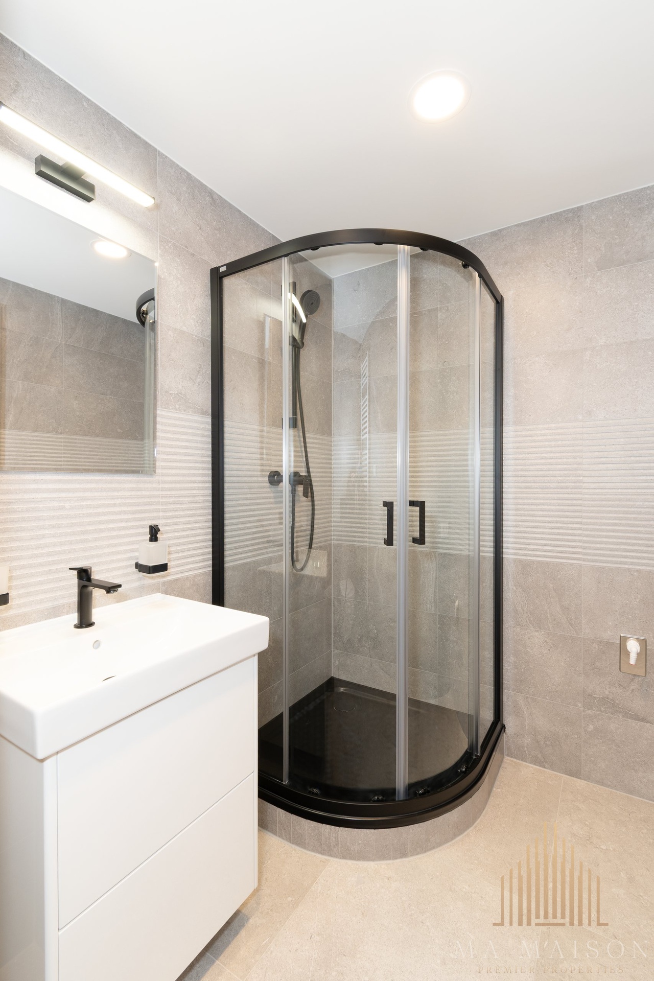 Byt se nachází v 5. patře a disponuje světlým obytným prostorem s kuchyňským koutem, který je vybaven moderními spotřebiči, jako je elektrická trouba, varná deska, digestoř, lednice a myčka na nádobí. V předsíni se nachází vestavěná šatní skříň. Koupelna je vybavena sprchovým koutem, umyvadlem, WC a zrcadlem s osvětlením.