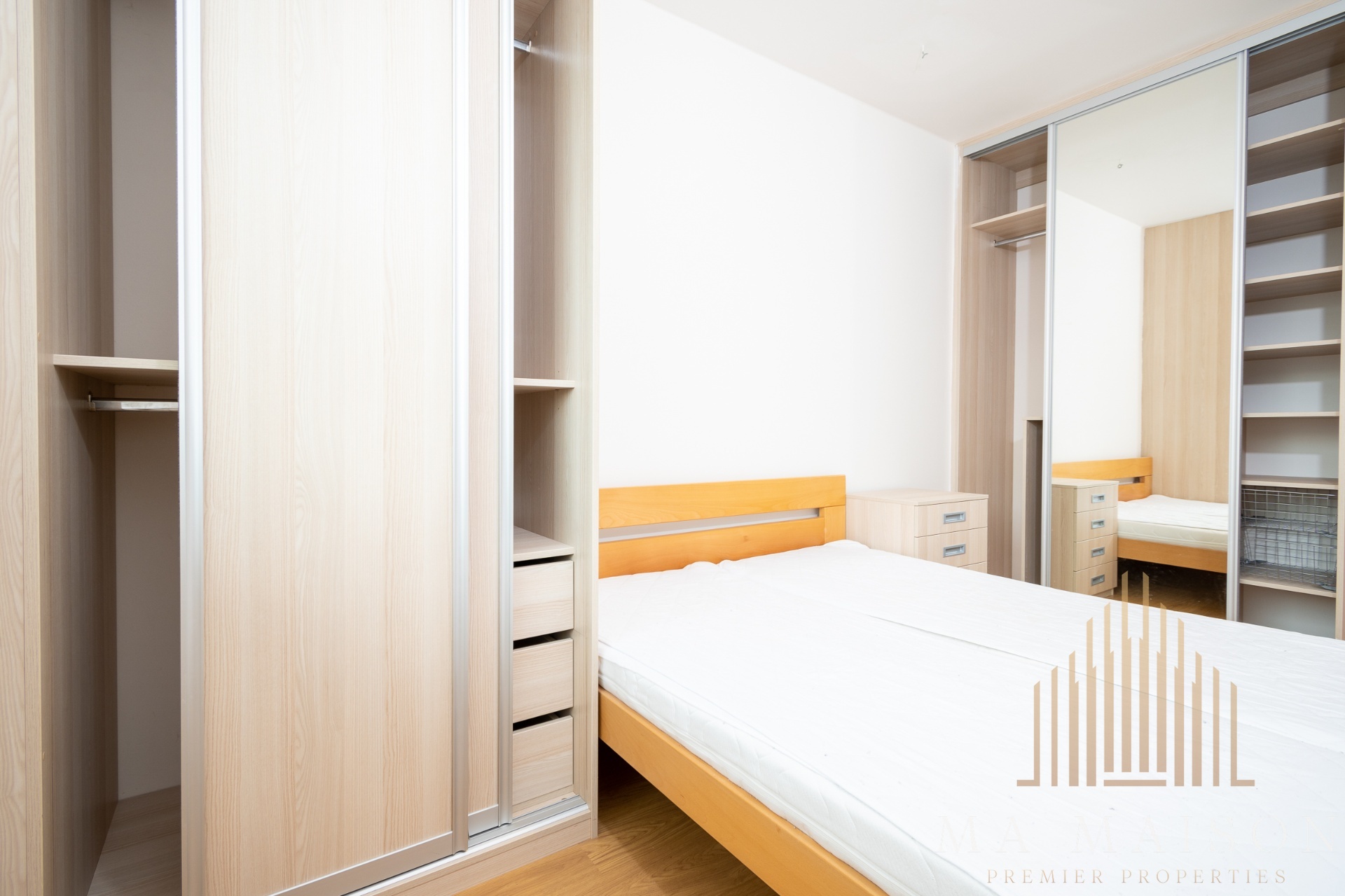 Byt se nachází v 4. patře budovy s výtahem a sestává ze: vstupní předsíně s vestavěnou šatní skříní, komory s pračkou a policovým systémem, koupelny s vanou, WC a úložnými prostory, samostatné ložnice, vybavené manželskou postelí a šatními skříněmi včetně komody se šuplíky a pracovní desky a z obývacího pokoje s kuchyňským koutem, kde je k dispozici rozkládací pohovka, TV stěna včetně TV, jídelní stůl, lednice s mrazákem, myčka nádobí, trouba, varná deska, mikrovlnka a spousty úložných prostorů. K bytu náleží vlastní balkon 4 m² přístupný z obývacího pokoje. Obyvatelé bytu jistě ocení, obzvláště v letním období, síťky proti hmyzu v oknech a u balkonových dveří.