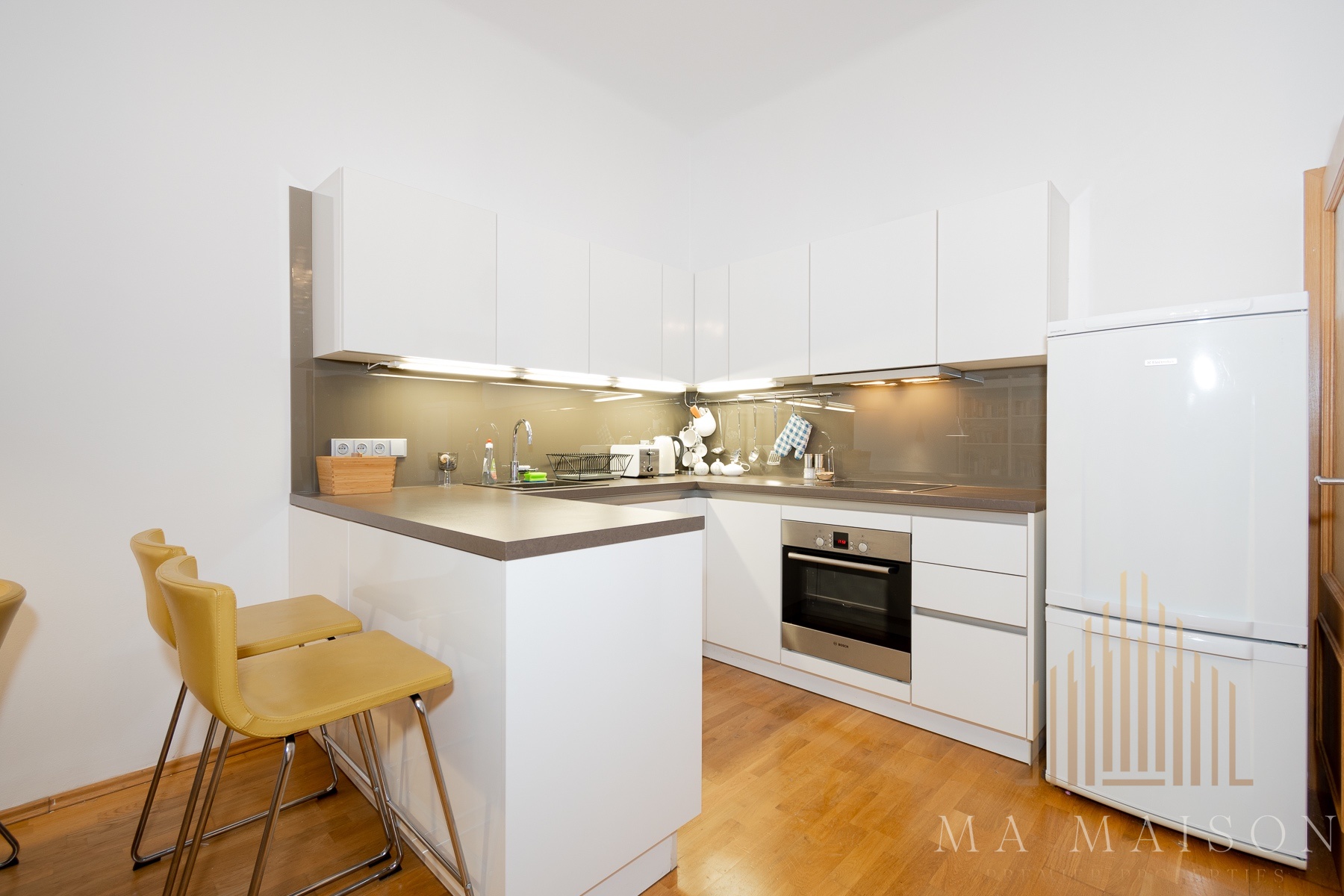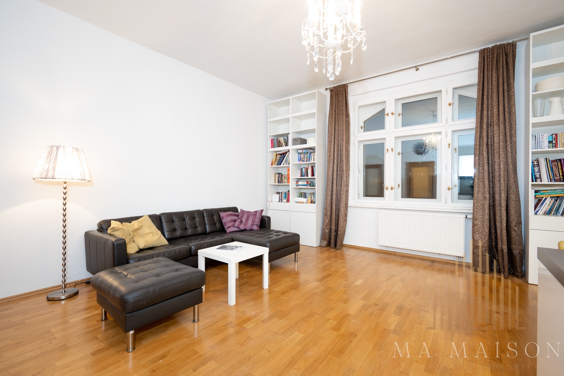 Byt o velikosti 74 m2 se nachází ve 2. patře historického činžovního domu s výtahem. Sestává z prostorné předsíně, koupelny s toaletou, ložnicí a obývacím pokojem, který je spojený s kuchyňskou linkou. Kuchyňská linka je kompletně vybavená vč. všech spotřebičů - tj. varná deska, digestoř, trouba, lednice s mrazákem a myčka. Součástí linky je kuchyňský bar s barovými židlemi. Součástí je rovněž jídelní stůl s jídelními židlemi. Kuchyň je kompletně vybavená potřebným nádobím. Obývací pokoj je dále vybaven koženou sedací soupravou, konferenčním stolkem a knihovnami. Ložnice je vybavena vestavnou šatní skříní, manželskou postelí vč. matrací a roštů. Dále noční stolky, lampy a líčící stolek. Koupelna je vybavena sprchovým koutem / vanou, pračkou, toaletou, umyvadlem se zrcadlem. Chodba v bytě je vybavena vestavnou šatní skříní, komodami a botníkem.