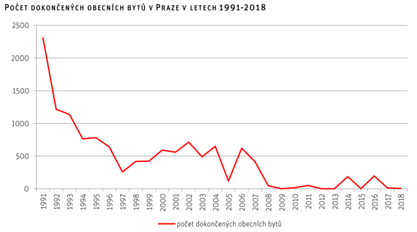 Řešením by mohlo být samotné město, které by se k výstavbě obecních bytů přihlásilo. Nyní je však realita odlišná, když obecní byty tvoří asi 5 % bytového fondu. Jen mezi lety 2011 a 2019 se obecní bytový fond v Praze zredukoval o více než polovinu (zdroj). Za poslední desetiletí realizovala Správa hl. města Prahy pouze minimální množství projektů nové bytové výstavby (viz graf ze Studie kvality života Pražanů 11/2019).
