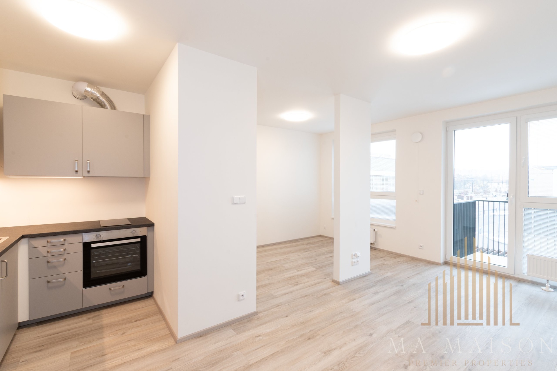 Dispozičně je byt řešen velmi prakticky. Ve vstupní chodbě se nachází šatní skříň. Koupelna je vybavena vanou, umyvadlem se zrcadlem a WC. Hlavní obytný prostor s kuchyňským koutem nabízí moderní kuchyňskou linku se všemi spotřebiči – sporákem, troubou, digestoří, myčkou a lednicí s mrazákem.