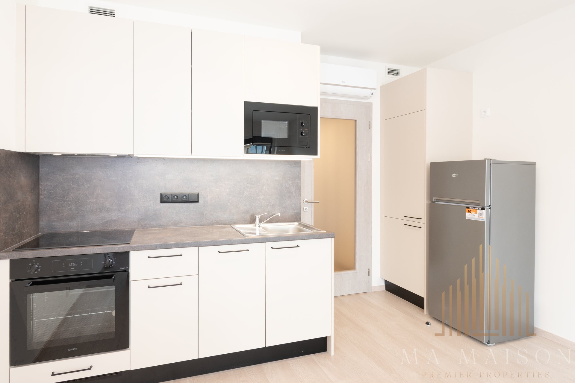 Byt se nachází v 5. patře a disponuje světlým obytným prostorem s kuchyňským koutem, který je vybaven moderními spotřebiči, jako je elektrická trouba, varná deska, digestoř, lednice a myčka na nádobí. V předsíni se nachází vestavěná šatní skříň. Koupelna je vybavena sprchovým koutem, umyvadlem, WC a zrcadlem s osvětlením.